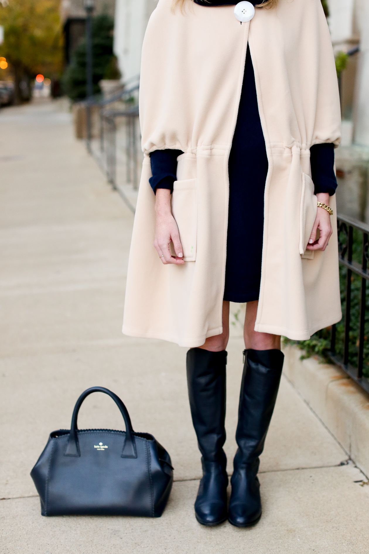 Sale to Sable Sweater Dress c/o (Scroll down to get a 25-percent-off STS coupon code!) / Dudley Stephens Fleece Cape c/o / Ted & Muffy Custom Riding Boots c/o / Kate Spade Bag (Old, similar here) / J.Crew Bracelet (Also LOVE this one, this one, and this one. Haha!) / Moon and Lola Earrings c/o / C.Wonder Bracelet (Old, similar here)